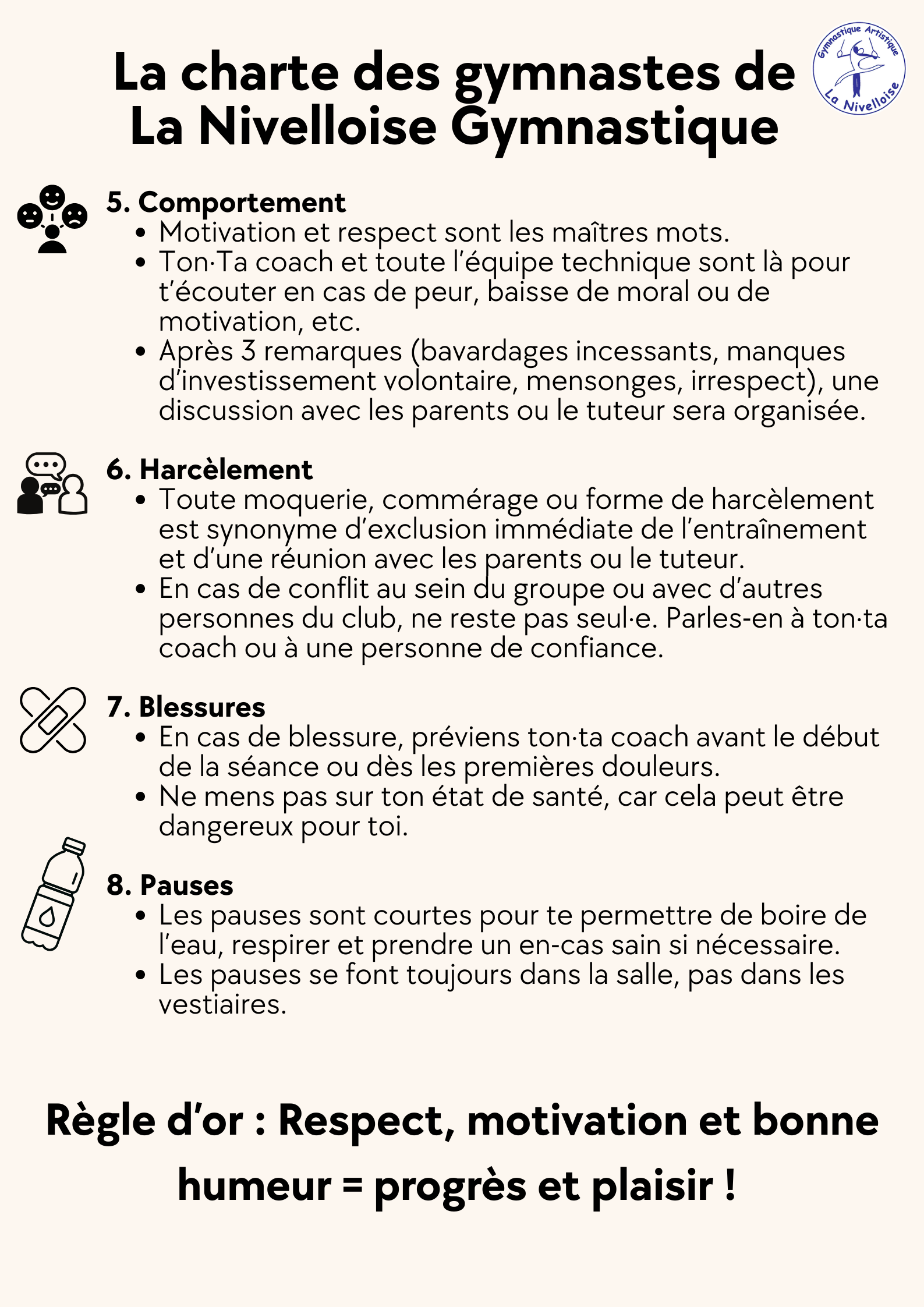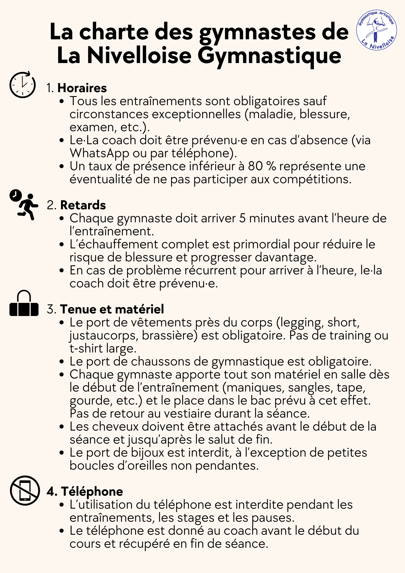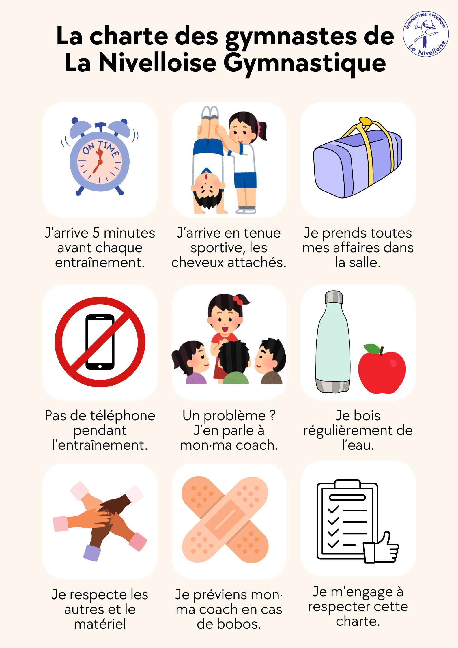 - ✅ Charte des gymnastes : présentée à chaque enfant, adaptée à son âge, avec une version simplifiée en pictogrammes pour les plus jeunes. Elle met en avant des principes simples : respect des autres, du matériel, des règles de sécurité et de l’esprit d’équipe.